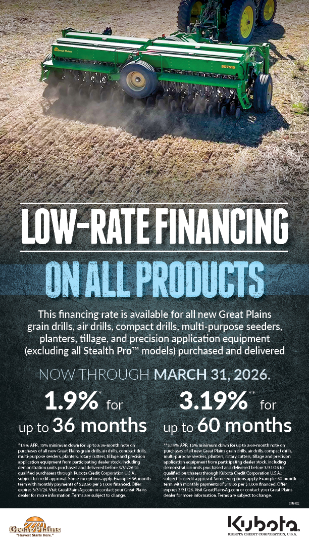*1.9% APR, 15% minimum down for up to a 36-month note onpurchases of all new Great Plains grain drills, air drills, compact drills,multi-purpose seeders, planters, rotary cutters, tillage and precisionapplication equipment from participating dealer stock, includingdemonstration units purchased and delivered before 3/31/26 toqualified purchasers through Kubota Credit Corporation U.S.A.;subject to credit approval. Some exceptions apply. Example: 36-monthterm with monthly payments of $28.60 per $1,000 financed. Offerexpires 3/31/26. Visit GreatPlainsAg.com or contact your Great Plainsdealer for more information. Terms are subject to change.